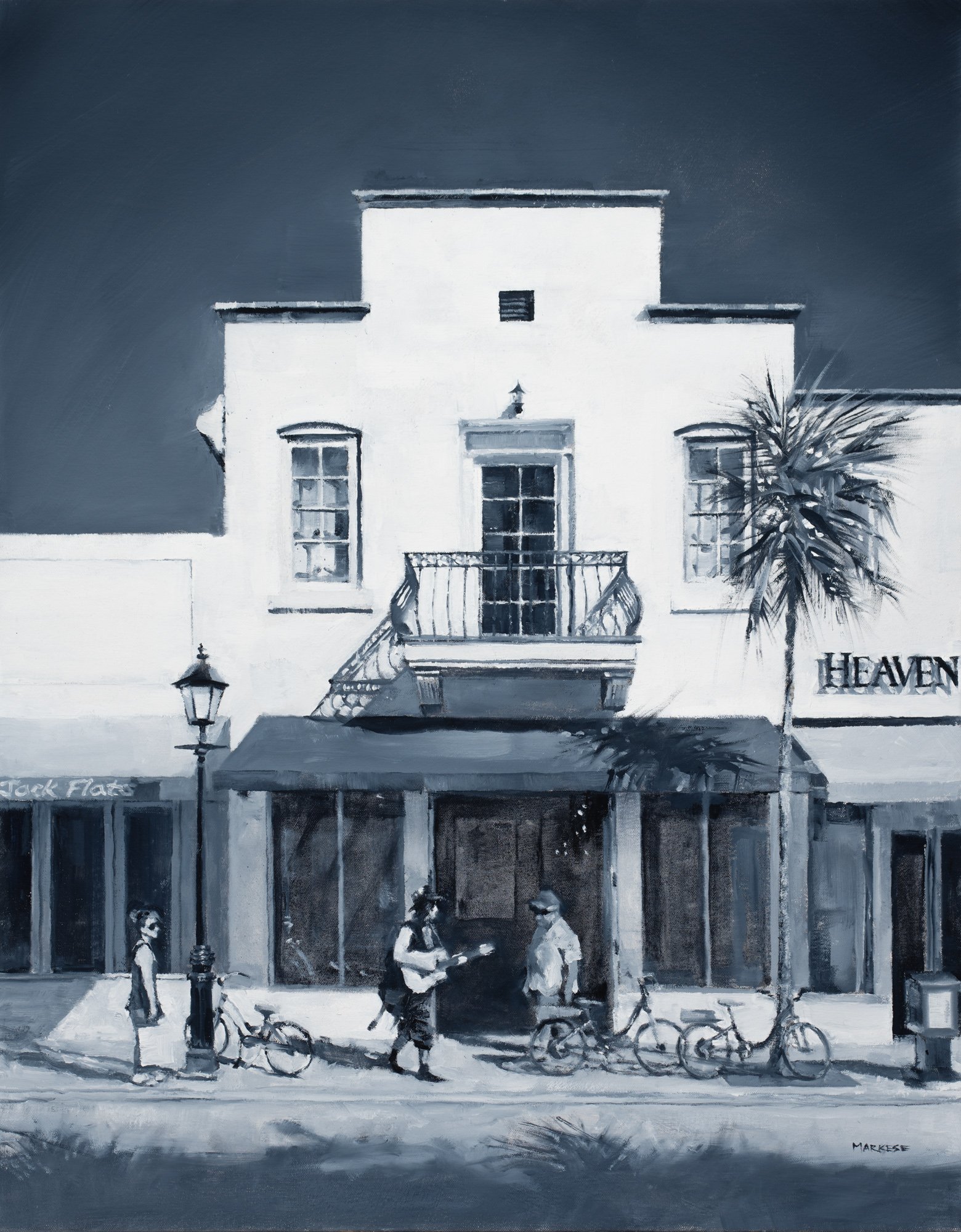 Heaven on Duval Street is a monochromatic oil painting capturing the lively storefronts of Duval Street in Key West. Rendered in a unified tonal range, the scene emphasizes atmosphere over detail, allowing light, shadow, and texture to define the space. Tourist shops line the street while buskers hustle along the sidewalk, and bicycles weave through the composition, reflecting the relaxed, pedal-powered culture of the island. The limited palette lends the bustling scene a sense of cohesion and nostalgia, transforming everyday street life into a timeless portrait of place and movement.